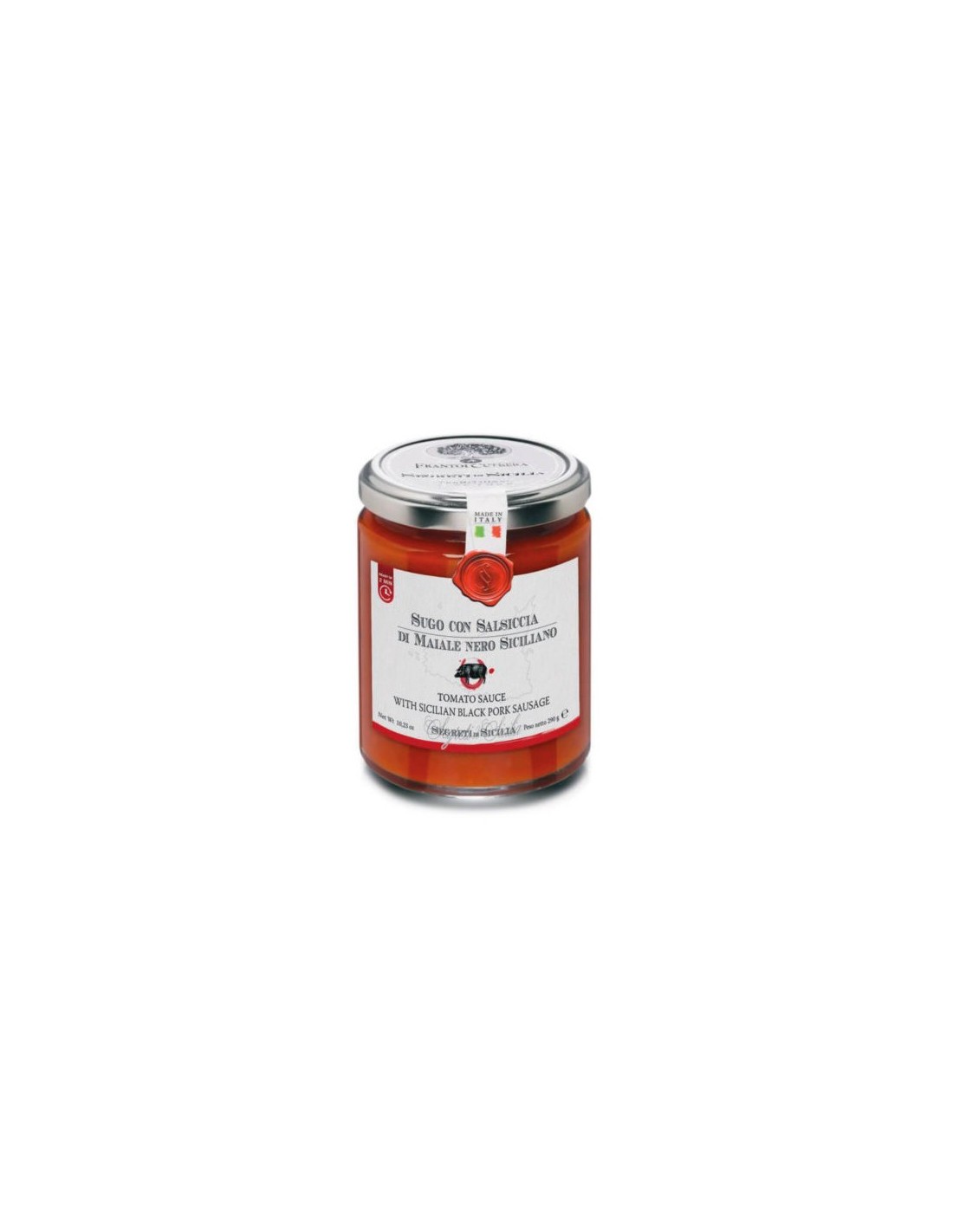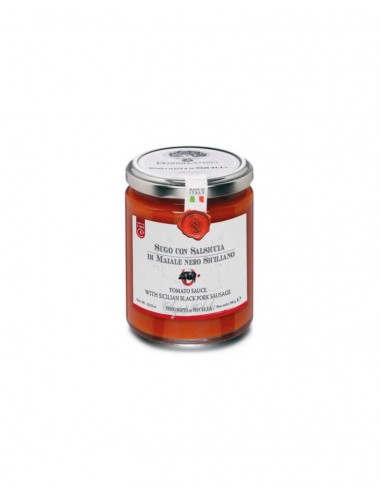 Ingredienti Salsa di pomodoro, salsiccia di maiale nero siciliano (carne di maiale, sale, semi di finocchio selvatico, peperoncino) olio extravergine di oliva Frantoi Cutrera, sale, zucchero, cipolla, alloro, semi di finocchio selvatico, pepe nero. Acido: acido citrico