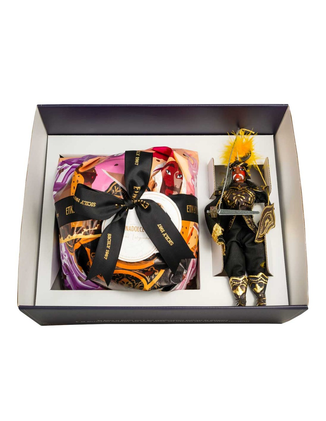Panettone Vulcano e Crema al Cioccolato di Modica IGP Etnadolce da 1 Kg Confezione in Scatola con Pupo Siciliano “Ferrau”