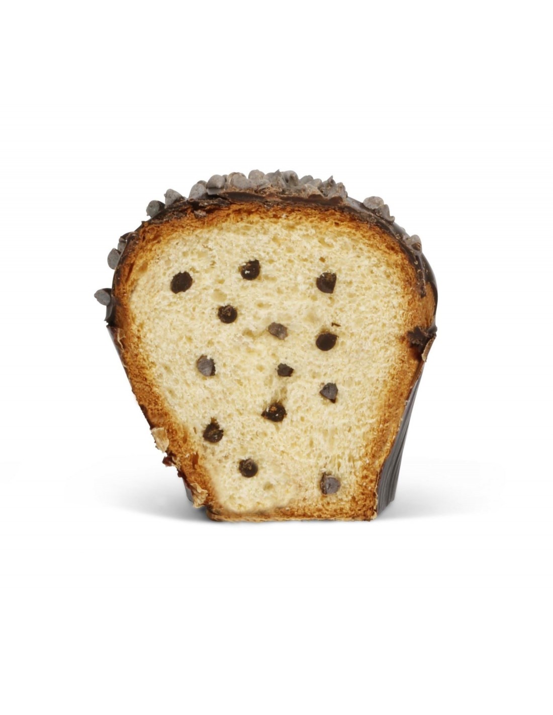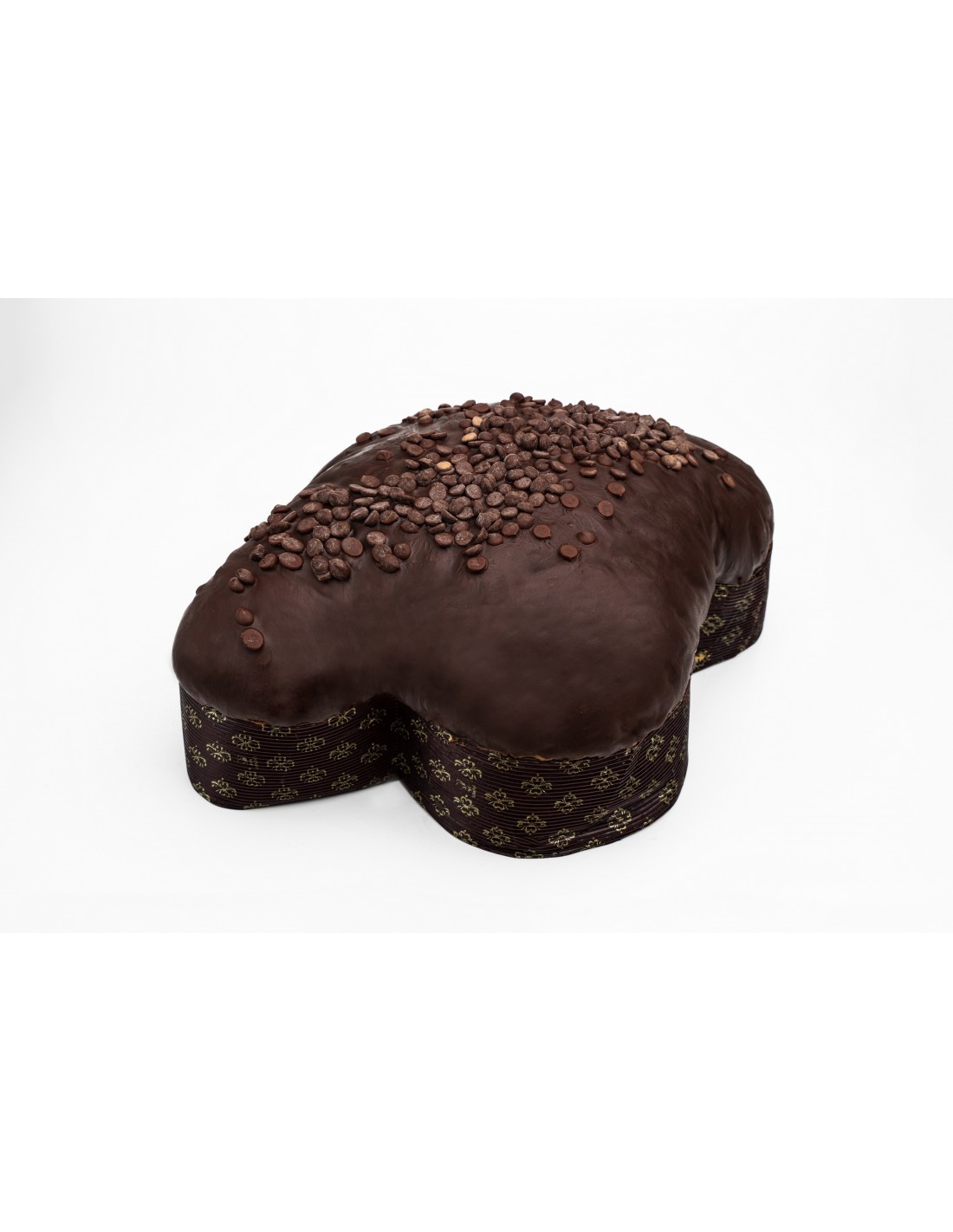 Dolce da forno farcito con gocce di cioccolato, ricoperto di glassa cioccolato e gocce di cioccolato.
