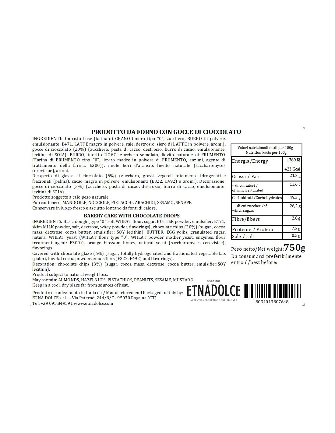 Le indicazioni riportate sulle etichette dei prodotti potrebbero variare per motivi da noi indipendenti, pertanto potrebbero esserci delle momentanee discrepanze tra le informazioni presenti sul sito e quelle presenti sui prodotti consegnati. Ti invitiamo a verificare sempre le informazioni riportate sul prodotto prima del suo consumo o utilizzo. Per la data di scadenza dettagliata scrivere a info@nelsonsicily.com.