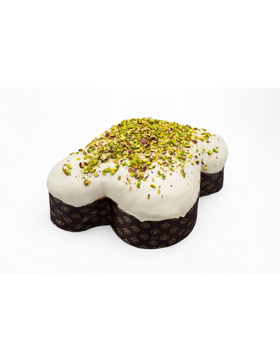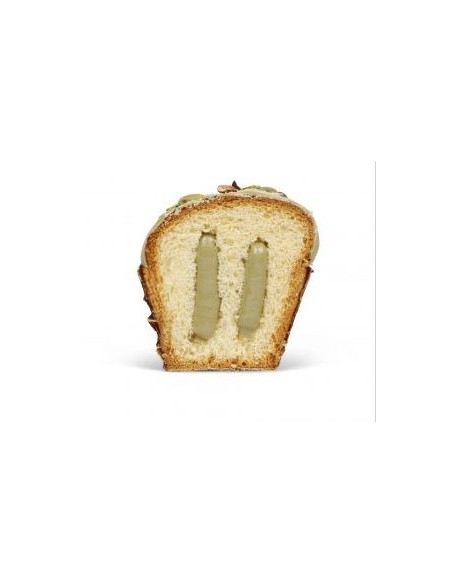 Colomba con crema di pistacchio, ricoperto di glassa al pistacchio e granella di pistacchio.